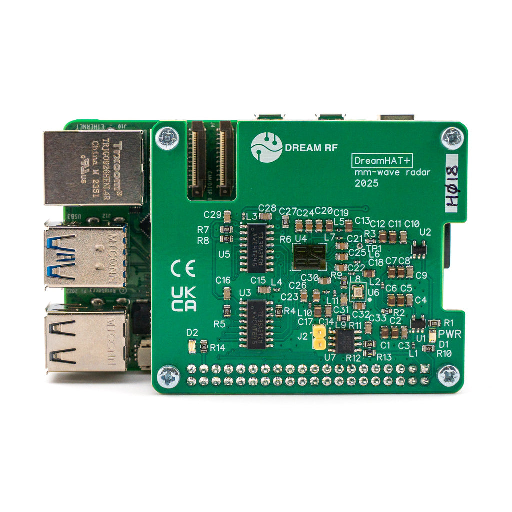 The 60 GHz mm-wave DreamHAT+ Radar is a cutting-edge Raspberry Pi 4B and 5 add-on, offering advanced ultra-wide band (UWB) frequency modulated continuous wave (FMCW) radar sensing capabilities in a compact and user-friendly package.