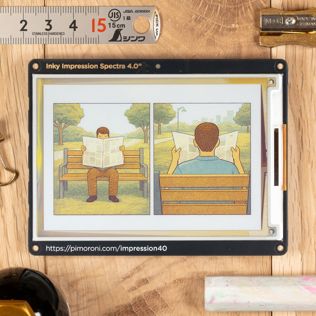 Our Inky Impression E Ink® displays are super crisp, low power and look great from a variety of viewing angles. They have high pixel density and bright vivid colours, perfect for showing off gorgeous dithered images (we've put a lot of effort into our dithering code and we hope you love it).